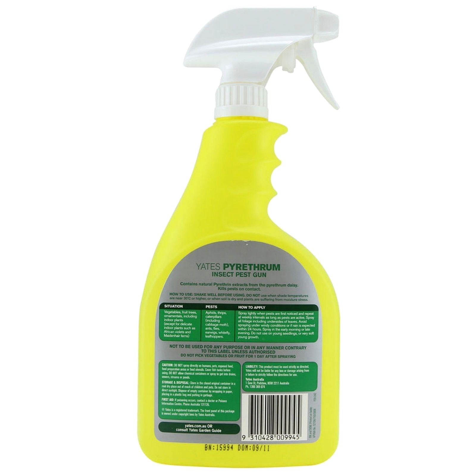 Yates pyrethrum insect pest gun 750ml. Identification of the product name: It is important to refer to the instructions. Rinse in fresh water after harvest to wash away any residue. Liquid formulations of pyrethrum sprayed into cracks and crevices will kill hiding insects. Controls a broad range of insect and mite pests, yet will not interfere with honey bees once the spray has dried. Yates garden insecticide kills a wide range of insect pests on vegetables, flowers, ornamentals and indoor plants. A wide variety of pest control insects killer 750ml options are available to you, such as specification, feature, and use. Kills a wide range of insect pests on vegetables, fruit trees, flowers, ornamentals and indoor plants. How would you rate yates pyrethrum insect control spray bottle & refill? Based on natural pyrethrum daisy extract. There are 356 suppliers who sells pest control insects killer 750ml on alibaba.com, mainly located in asia. The pyrethrum 5 ec dilutes at 4ml per litre, you will get over 60 litres of full strength spray from 1 250ml concentrate.