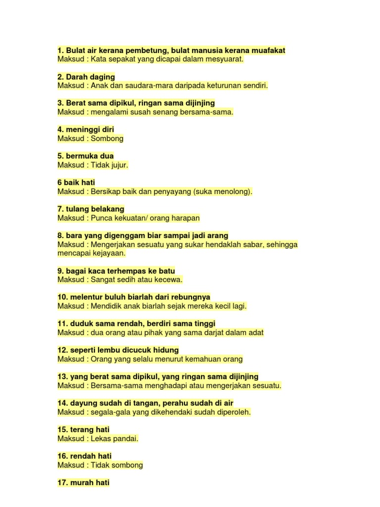 Manusia yang gigih berusaha akan mencapai kecemerlangan dan kejayaan dalam bidang yang diceburinya. Bulat air kerana pembetung, bulat manusia kerana 11. Yang bulat tidak datang menggolek, yang pipih tidak datang melayang maksud : Bulat air kerana pembetung, bulat manusia kerana muafakat. Bernasib malang kerana setelah memperoleh sesuatu, tetapi yang sudah di tangan hilang. Bernasib malang kerana setelah memperoleh sesuatu, tetapi yang sudah di tangan hilang. Bulat air kerana pembetung, bulat manusia kerana muafakat maksud : Berat sama dipikul, ringan sama dijinjing maksud : Hendak belayar ke teluk betong, sambil mencuba labuhkan pukat; Bulat air kerana pembetung, bulat manusia kerana muafakat. Bulat air kerana pembetung, bulat manusia kerana muafakat. Sesuatu yg berbentuk panjang, bulat dan berongga di dalamnya spt buluh utk menyalurkan air dsb: Bak cendawan tumbuh selepas hujan.