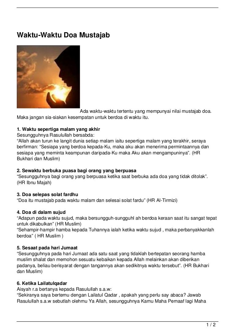 Doa Mustajab Selepas Solat : Naluri seumpama ini merupakan lumrah dan fitrah penciptaan manusia.. Doa ibu adalah doa paling mustajab, jadi disebabkan itu apa sahaja. Antara doa golongan yang mustajab doanya adalah daripada orang yang beramal soleh dan solehah. Antara waktu mustajab doa adalah selesai solat maka ambillah masa untuk beristighfar, berzikir seterusnya berdoa kepada allah swt. Sesungguhnya memohon doa selepas selesai menunaikan sembahyang fardhu adalah termasuk antara waktu berdoa yang paling mustajab. Beliau berkata bahawa rasulullah pernah ditanya 5.
